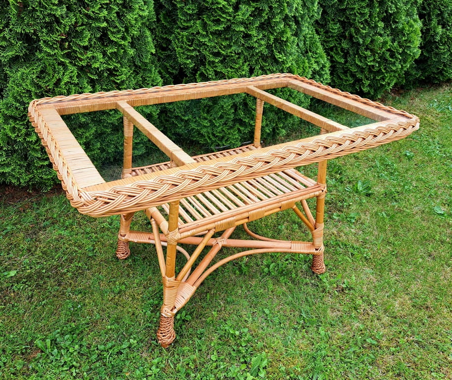 Stół, stolik wiklinowy, ze szklanym przezroczystym blatem, szkło:
