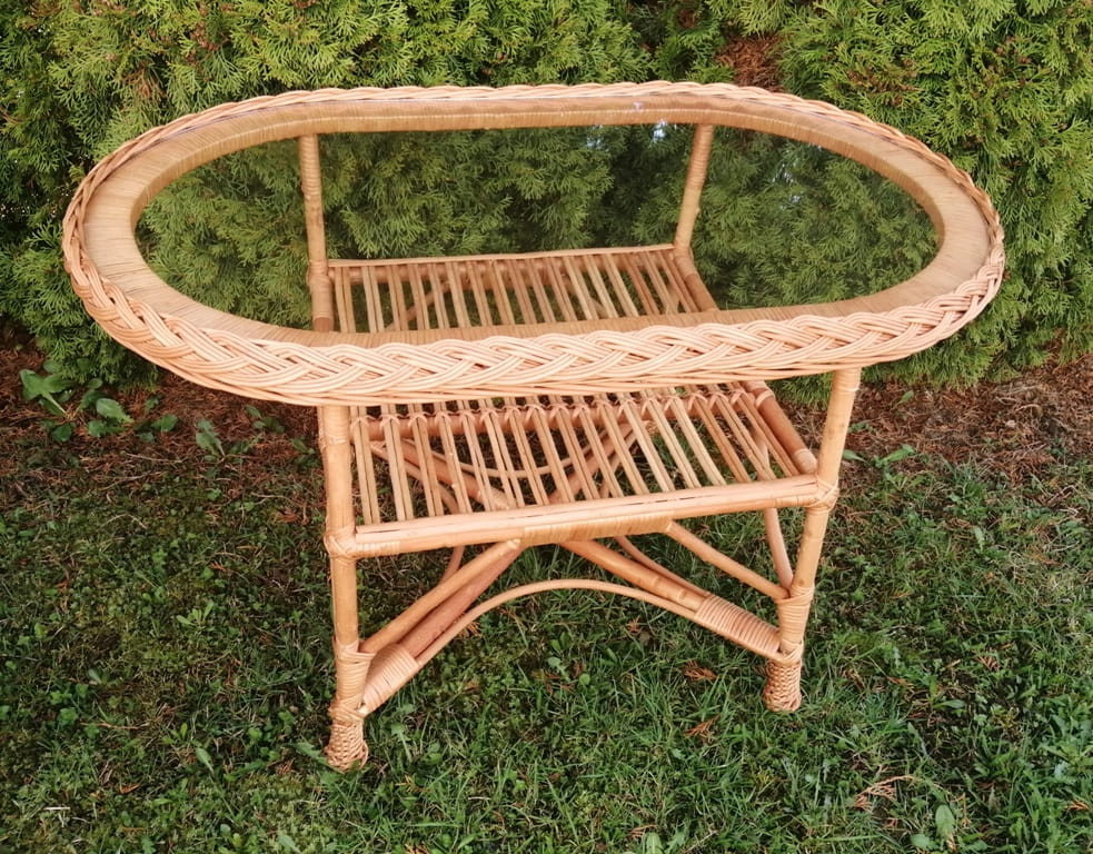 Stół wiklinowy, stolik ze szklanym blatem, owalny dł 100 cm